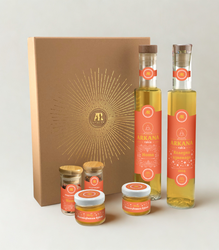 Тази специална кутия съдържа нашите уникални рецепти за двете ни ракии - Аркана Коледна изненада 2024 и Аркана Нота, които разработихме под вдъхновението на Гергана Мирчева от Ракияшоп (https://rakiashop.eu/ ) и съвместно с партньорите ни от Spizing (https://spizing.com/).