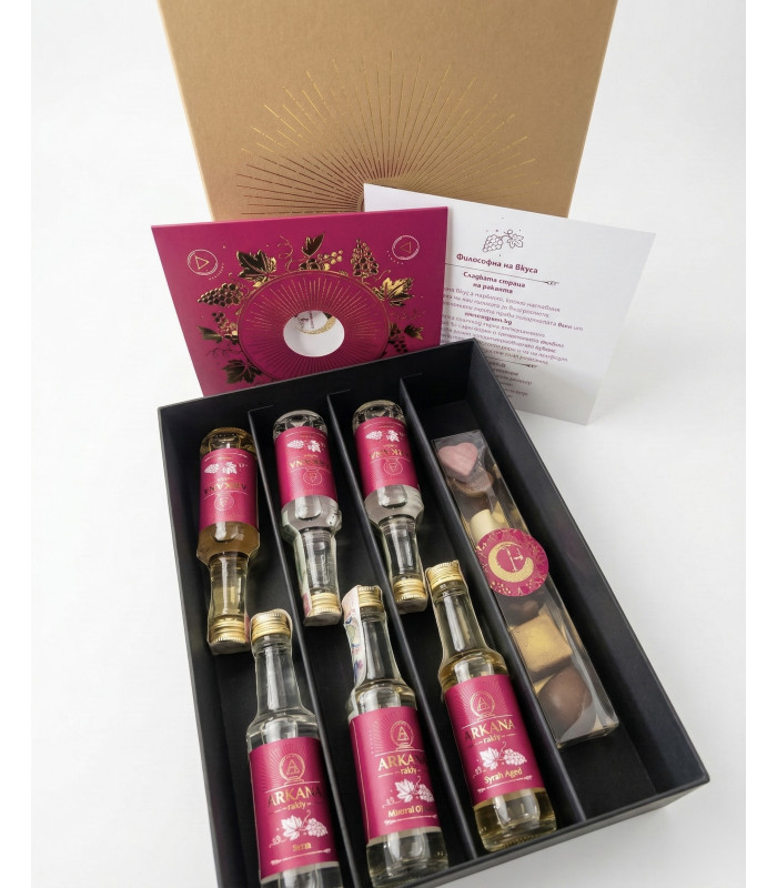 Специална селекция - Ракиена сладост е подаръчен комплект от серията „5 години Философия на вкуса“, създаден за хора, които ценят богатството на ароматите и удоволствието от добре подбраните вкусове. В този сет сме събрали шест миниатюрни бутилки по 50 мл от Arkana муксто, отлежала Arakana , Arkana Zefira, Arkana Nota, Arkana Borea и Arkana Eura допълнени от шест бонбона по 13 грама, картичка и елегантна кутия за сет от Arkana Anemi.