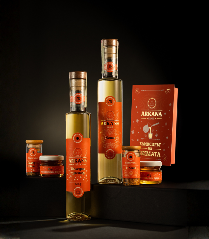 Тази специална кутия съдържа нашите уникални рецепти за двете ни ракии - Аркана Коледна изненада 2024 и Аркана Нота, които разработихме под вдъхновението на Гергана Мирчева от Ракияшоп (https://rakiashop.eu/ ) и съвместно с партньорите ни от Spizing (https://spizing.com/).